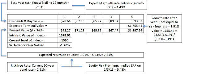 To see the interplay of these numbers and the resulting consequences for stocks, I valued the S&P 500, as of March 26, 2013, using the following inputs: