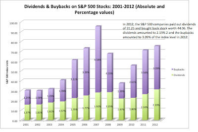 Over the last decade, buybacks have been more volatile than dividends but the bulk of the cash flows returned to stockholders has come in buybacks. b. Level: In the most recent twelve months for which data is available (through December 2012), the companies in the S&P 500 bought back almost $400 billion worth of stock, much more than the $270 billion that they paid out in dividends. In terms of index units and as a percent of the level of the index, the aggregate cash flows have recovered fully from their post-2008 swoon. c. Sustainability: While it is good that cash flows are bouncing back, we should worry about whether companies were over reaching and paying out too much in 2012, perhaps in advance of the fiscal cliff at the end of 2012, in which case you should expect to see a drop off in cash flows in the near term. There are three reasons to believe that this is not the case. First, as Birinyi Associates notes in this blog post, the pace of buybacks is increasing in 2013, not dropping off, with the buybacks authorized in February 2013 at an all-time high. Second, the cash returned in 2012 may have been a historic high in dollar value terms, but as a percent of the index, it is close to the average yield over the last decade. Third, the aggregate cash balances at the S&P 500 company amounted to 10.66% of firm value at the end of 2012, suggesting that companies have cash on hand to sustain and perhaps even increase cash returned to stockholders. While a portion of this cash is trapped, it is possible that corporate tax reform, if it happens, will release this cash for distribution to stockholders.