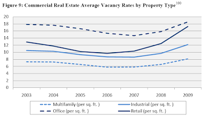 Executive Summary Over the next few years, a wave of commercial real estate loan failures could threaten America’s already-weakened financial system. The Congressional Oversight Panel is deeply concerned that commercial loan losses could jeopardize the stability of many banks, particularly the nation’s mid-size and smaller banks, and that as the damage spreads beyond individual banks that it will contribute to prolonged weakness throughout the economy. Between 2010 and 2014, about $1.4 trillion in commercial real estate loans will reach the end of their terms. Nearly half are at present “underwater” – that is, the borrower owes more than the underlying property is currently worth. Commercial property values have fallen more than 40 percent since the beginning of 2007. Increased vacancy rates, which now range from eight percent for multifamily housing to 18 percent for office buildings, and falling rents, which have declined 40 percent for office space and 33 percent for retail space, have exerted a powerful downward pressure on the value of commercial properties. The largest commercial real estate loan losses are projected for 2011 and beyond; losses at banks alone could range as high as $200-$300 billion. The stress tests conducted last year for 19 major financial institutions examined their capital reserves only through the end of 2010. Even more significantly, small and mid-sized banks were never subjected to any exercise comparable to the stress tests, despite the fact that small and mid-sized banks are proportionately even more exposed than their larger counterparts to commercial real estate loan losses. A significant wave of commercial mortgage defaults would trigger economic damage that could touch the lives of nearly every American. Empty office complexes, hotels, and retail stores could lead directly to lost jobs. Foreclosures on apartment complexes could push families out of their residences, even if they had never missed a rent payment. Banks that suffer, or are afraid of suffering, commercial mortgage losses could grow even more reluctant to lend, which could in turn further reduce access to credit for more businesses and families and accelerate a negative economic cycle. It is difficult to predict either the number of foreclosures to come or who will be most immediately affected. In the worst case scenario, hundreds more community and mid-sized banks could face insolvency. Because these banks play a critical role in financing the small businesses that could help the American economy create new jobs, their widespread failure could disrupt local communities, undermine the economic recovery, and extend an already painful recession. Present Condition of Commercial Real Estate The commercial real estate market is currently experiencing considerable difficulty for two distinct reasons. First, the current economic downturn has resulted in a dramatic deterioration of commercial real estate fundamentals. Increasing vacancy rates and falling rental prices present problems for all commercial real estate loans. Decreased cash flows will affect the ability of borrowers to make required loan payments. Falling commercial property values result in higher LTV ratios, making it harder for borrowers to refinance under current terms regardless of the soundness of the original financing, the quality of the property, and whether the loan is performing. Second, the development of the commercial real estate bubble, as discussed above, resulted in the origination of a significant amount of commercial real estate loans based on dramatically weakened underwriting standards. These loans were based on overly aggressive rental or cash flow projections (or projections that were only sustainable under bubble conditions), had higher levels of allowable leverage, and were not soundly underwritten. Loans of this sort (somewhat analogous to “Alt-A” residential loans) will encounter far greater difficulty as projections fail to materialize on already excessively leveraged commercial properties. Economic Conditions and Deteriorating Market Fundamentals The health of the commercial real estate market depends on the health of the overall economy. Consequently, the market fundamentals will likely stay weak for the foreseeable future. This means that even soundly financed projects will encounter difficulties. Those projects that were not soundly underwritten will likely encounter far greater difficulty as aggressive rental growth or cash flow projections fail to materialize, property values drop, and LTV ratios rise on already excessively leveraged properties. New and partially constructed properties are experiencing the biggest problems with vacancy and cash flow issues (leading to a higher number of loan defaults and higher loss severity rates than other commercial property loans). For the last several quarters, average vacancy rates have been rising and average rental prices have been falling for all major commercial property types.