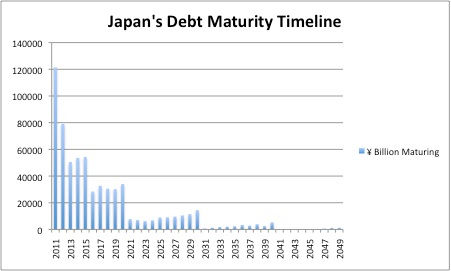 Moreover, an April 2011 analysis by CQCA Business Research showed that “Japan has an extremely near-future tilted debt maturity timeline” (see chart below). CQCA estimated that in 2010, Japan was able to push 105 trillion yen into the future, but concluded it is doubtful that Japan will be able to continue this.