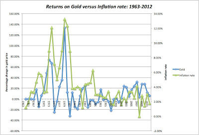 A. Against the inflation index The most comprehensive paper that I have seen on the relationship between gold prices and inflation is available here, with a follow up here. In these papers, the price of gold is related to the CPI index and a ratio of gold prices to the CPI index is computed. I try to replicate their findings and I use the US Department of Labor CPI index for all items (and all urban consumers) set to a base of 100 in 1982-84, but with data going back to 1947. The level of the index at the end of 2012 was 231.137. Dividing the gold price of $1664/oz on December 31, 2012, by the CPI index level yields a value of 7.20. To get a measure of whether that number is high or low, we computed it every year going back to 1963: